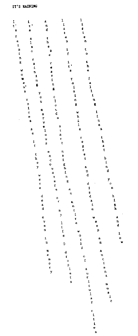 The poem "It's Raining", by Guillaume Appollinaire is a great exaple of a poet's freedom to use the space of the whole page without actually filling it with text. The lines re ad from left to right, line by line, but vertically within the line. the reader's eye moves in a different way than the usual to read this and many other shaped poems. The effect is that the reader spends more time with the poem, since she cannot skim t he words as with normal text.