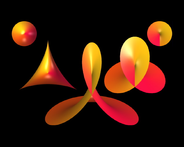 This image represents several views of the graph of the complex squaring function, which lives naturally in a four-dimensional space.