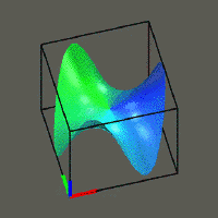 This final movie shows the last view of the surface, which we can think of as the graph of the imaginary part of the inverse of the cube (i.e., the complex cubed root). Here, the ramification point appears as a pinch point on the surface, at the origin. The self-intersection appears as a cubic curve on the surface
