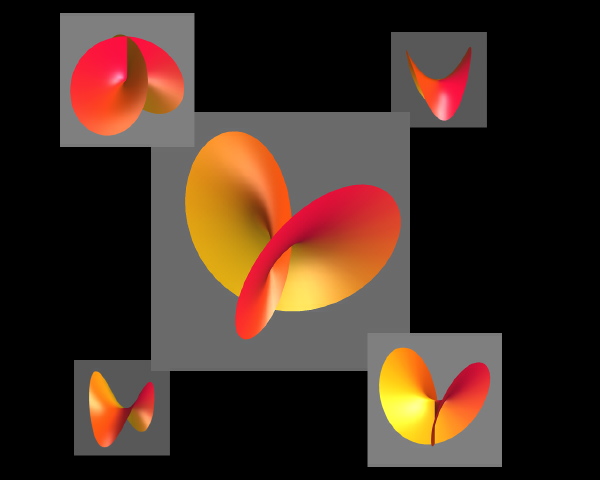 This image represents several views of the graph of the complex squaring function, which lives naturally in a four-dimensional space.