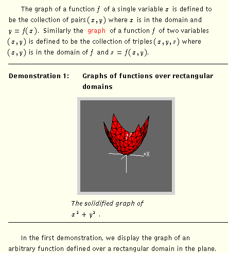 When students log on to this program, they are given text and pictures. The picture is "live", so that selecting the picture gives a control panel and two windows containing the domain of the function and its graph. By moving the mouse in the window containing the function graph, it is possible to rotate the graph in three-space in real time, either in wire-frame or in solid mode.