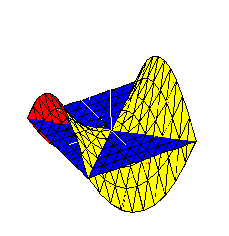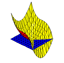 Students can make changes in the surface definition to see the effects in the function graphs. It is also possible to choose to display the domain of the function as a subset of the horizontal coordinate plane, so that even in the very first demonstration, students are challenged to observe and make conjectures about the way a surface intersects a plane. Students can always choose to look at the graph from the viewpoint of the z-axis (or the negative z-axis), or from any other axis. They can also alter the resolution of the graph in order to get a better idea of the nature of the intersection of a function graph and its tangent plane at the origin.