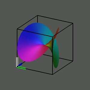 We can now observe the graph of the squaring function where the domain is restricted to the unit disc. When we look at the graph itself, we display the domain in the (x,y) plane and watch as we move from the real to the imaginary part of the squaring function. Effectively we are projecting into three-space the locus (x, y, cos(a) u + sin(a) v) as the angle a goes from 0 to pi/2, where the points (x, y) are restricted to lie in the unit disc x^2 + y^2 <= 1.