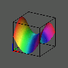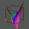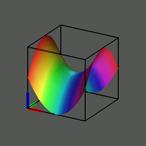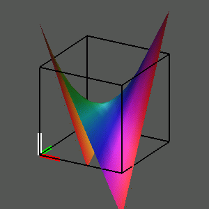 In the same way, we can look at the graph of the squaring function w = z^2. We can approach this by finding the real coordinates of the points on the graph, first expanding the square of x + yi algebraically and then separating the resulting complex number into its real and imaginary parts: z^2 = (x + yi)^2 = x^2 + 2xyi + (yi)^2 = (x^2 - y^2) + (2xy)i = u + vi. Thus we can insert into our four-dimensional grid the points (x, y, x^2 - y^2, 2xyi) where (x,y) runs over the points of the unit square. We can then observe various views of that graph as we rotate the hypercube.