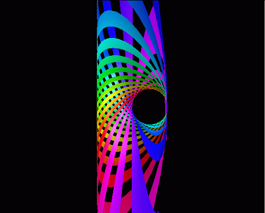 Half way through the rotation in four-dimensional space, the torus actually passes through the point of projection so the image in three-space is infinitely large, containing straight lines that are the images of circles going through the projection point. By selecting this picture, it is possible to see an animation (386K) of this infinite surface rotating in three-dimensional space.