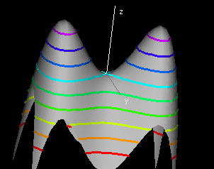 This demo shows a level set consisting of level curves f(x,y) = c for the Twin Peaks function f(x,y) = 3(-x4 + x2 - y2). A contour map is drawn in the window labeled "Domain: f(x,y)". The third window, labeled "Level Curves", allows you to choose a level curve f(x,y) = h by dragging the hotspot along the z-axis. The value of the constant h is shown in the control panel.