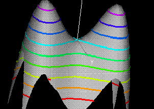 This demo shows a level set consisting of level curves f(x,y) = c for the Twin Peaks function f(x,y) = 3(-x4 + x2 - y2). A contour map is drawn in the window labeled "Domain: f(x,y)". The third window, labeled "Level Curves", allows you to choose a level curve f(x,y) = h by dragging the hotspot along the z-axis. The value of the constant h is shown in the control panel.