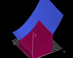 The method for summing the volume under a function graph described in the previous section used a height function which took the lowest point on the function graph above the sub-rectangle, called a lower sum. Similarly, an upper sum can be used by using a height function which takes the highest point on the function graph above the sub-rectangle.