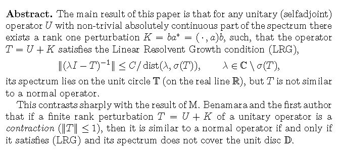 Linear resolvent growth of rank one perturbation of a unitary operator does not imply its similarity to a normal operatorby N. Nikolski and S. TreilTo the memory of Tom Wolff |