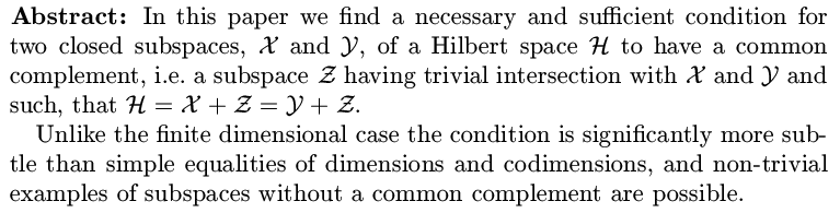 Common Complements of Two Subspaces of a Hilbert Space