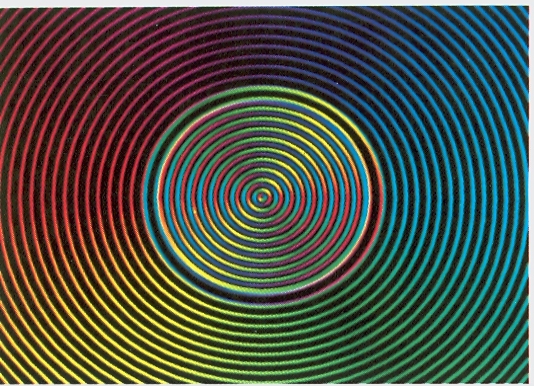 More interesting patterns emerge if the source is not a point or a line but rather an object with curvature. The simplest example occurs when a wave travels out from a circle in the plane. If we strike a metal circular cylinder immersed in a still pond, we send a pair of shock waves moving along the surface of the water. One shock wave merely continues outward in an ever-expanding set of nonintersecting concentric circles. The other wave moves inward toward the center. At the very center, the wave shrinks down to a single focal point and reemerges as another circle with the same center, heading outward and eventually passing through the cylinder. The waves will cover each point other than the center exactly twice. The color coding is not quite so effective as in the case of a point source or line source since it is no longer true that each point has a unique color.